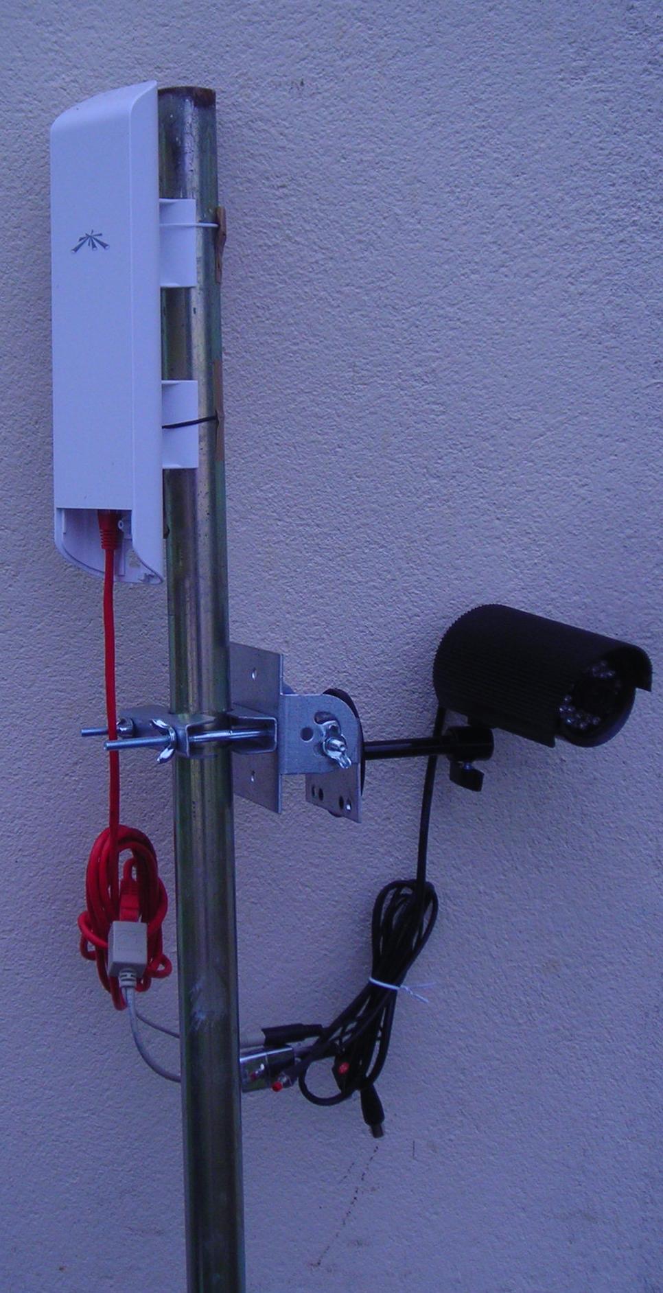 Sur cette photo, vous apercevez le cordon ethernet rouge relié au second port de la Nanostation 5M, l’extracteur POE allant alimenter la caméra IP (à droite du mât). Nous utilisons le support d’origine de la caméra IP, relié à une fixation orientable de façon à pouvoir la diriger où bon nous semblera.