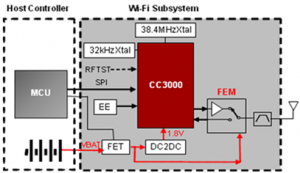 La puce WiFi CC3000 de Texas Instruments est une puce compacte, à faible consommation, destinée à être intégrée dans les appareils ménagers pour les relier au monde extérieur en WiFi. La puce peut fonctionner avec un simple micro-contrôleur disposant de 6 Ko de flash et 3 ko de RAM, pas plus. Une alimentation, un bus de communication, vous n’avez besoin de rien d’autre pour basculer une platine électronique en WiFi 802.11b/g