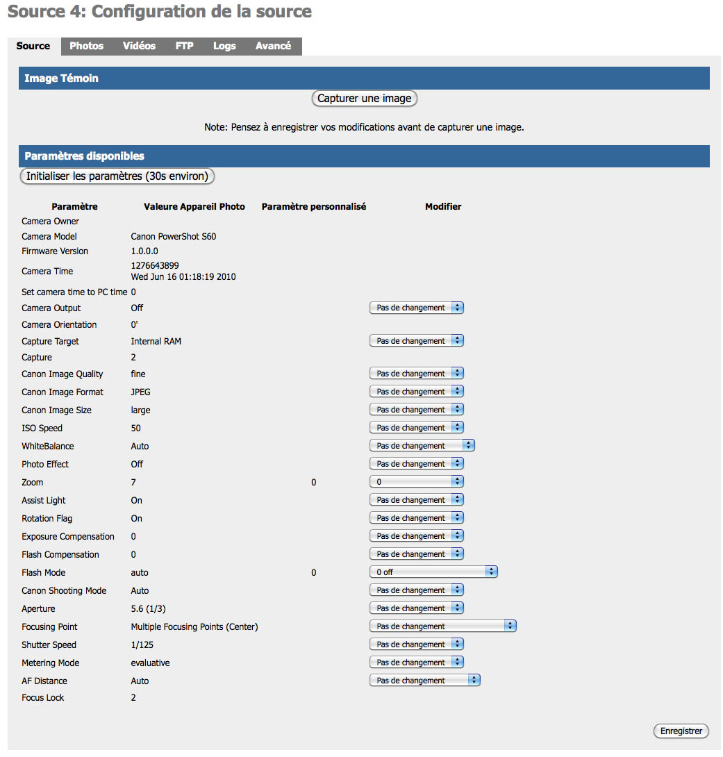 Évolution récente de notre Webcampak : la gestion des appareils photo numériques (APN), via un menu dédié. Ce menu permet d’effectuer un maximum de réglage sur l’appareil photo relié en USB au Webcampak, ici un PowerShot S60 de Canon.