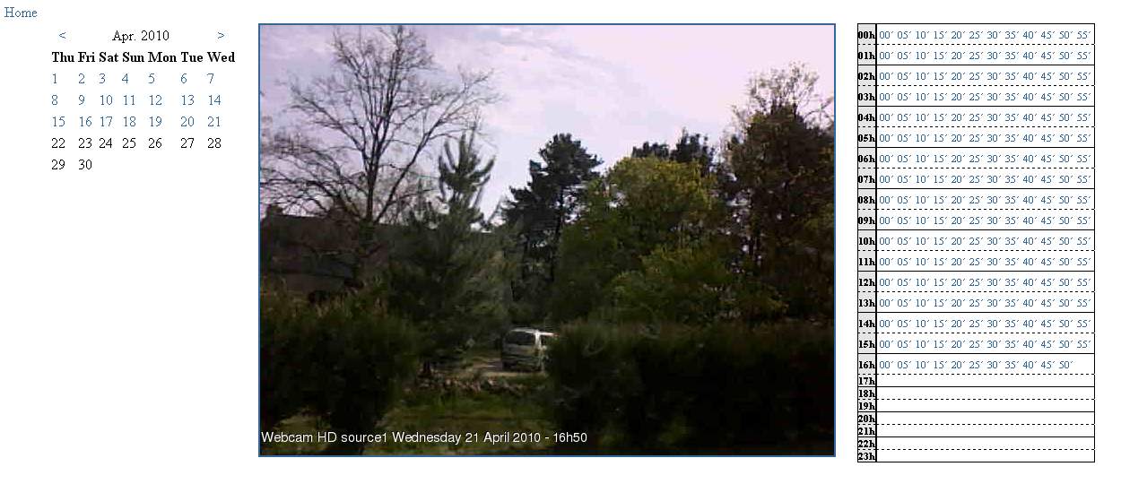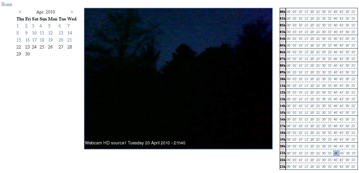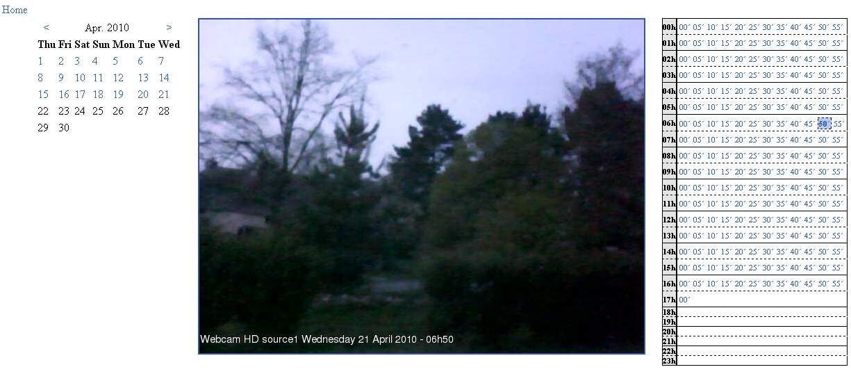 Sur la capture d’écran que je vous présente, vous pourriez ainsi choisir la date parmi les dates en couleur bleue, indiquant qu’il y a des archives disponibles. Vous pourriez ainsi choisir une heure différente (16h50 ici) et voir le jour se lever doucement sur la webcam USB HD :